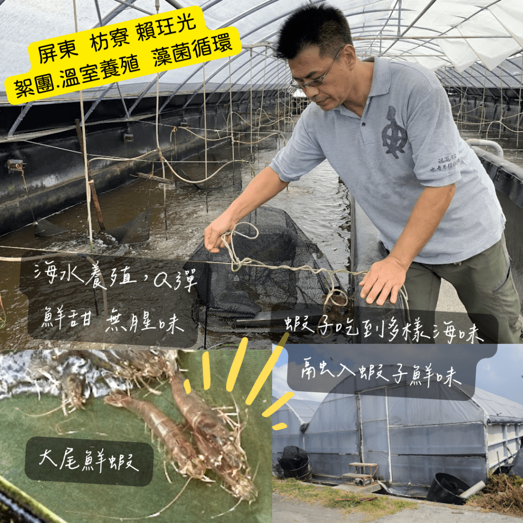 有產銷履歷認證,溫室裡引注海水養殖,以生物技術餵養出高品質、沒有腥味的蝦子(撥完蝦沒有腥味黏手)。養殖專家──賴玨光,長年擔任國際養殖顧問,會開設養殖場,是因為他想復振台灣的養蝦榮景,目標是養出與海裡的野生蝦一樣鮮甜Q彈的蝦子!