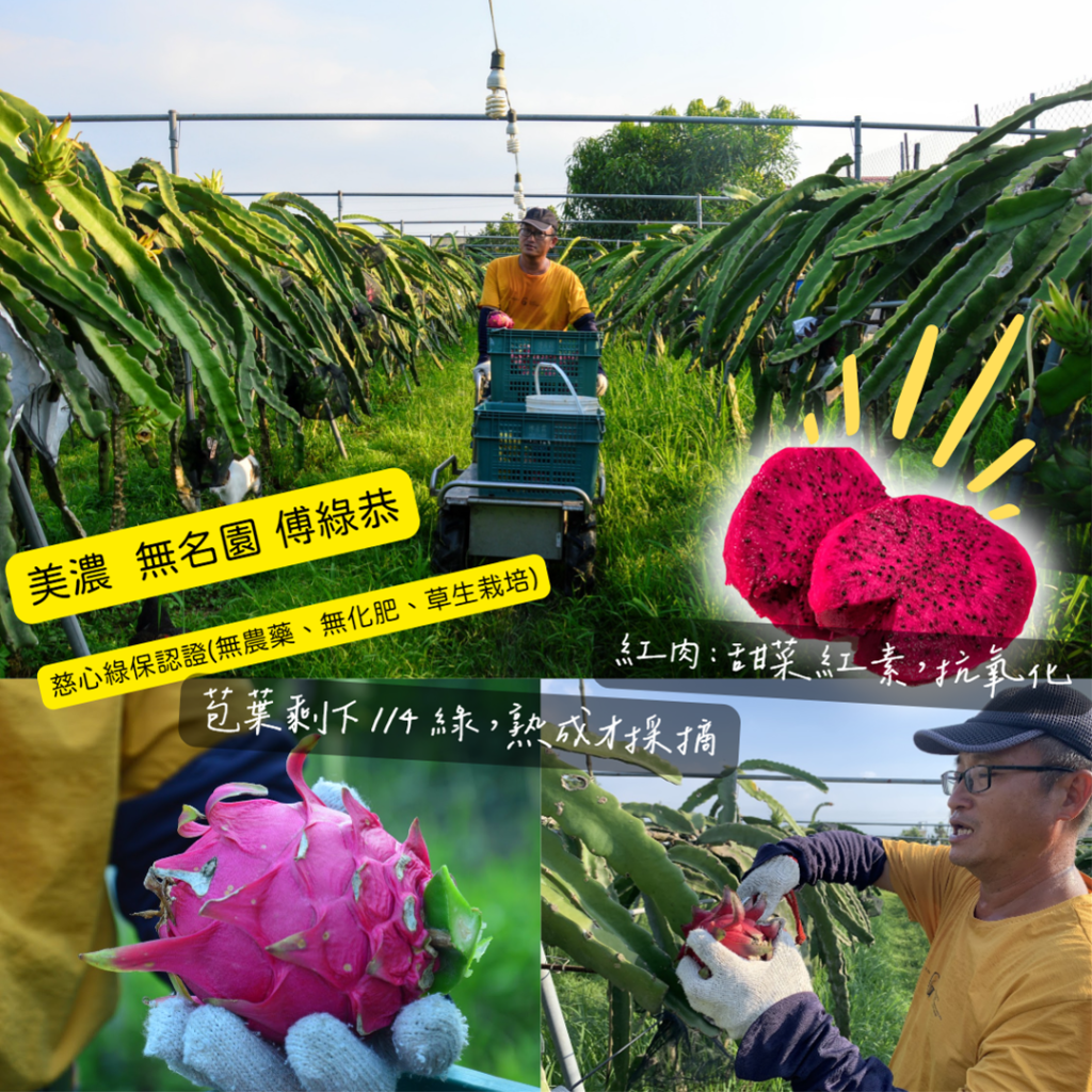 帶刺的火龍果園中孕育最柔軟的佛心果實,採收、挑蝸牛、刮除病葉,忍住火龍果刺扎滿手,每日除草做益肥、培好菌~維護棲地多樣性、不施藥,靠知識與技術種出甜度高,卻很清爽好消化的火龍果!