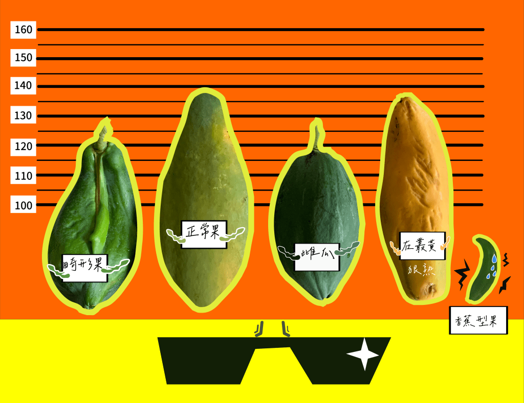 接下來的重頭戲便是摘果和挑除畸形果,重點是要通緝香蕉狀、五裂狀的畸形果。如果樹勢比較衰弱,掛果量多,高溫(35度C以上),開的花就會偏雄,產生類似香蕉形狀的果,或是乾脆不結果。但如果樹很強壯、氮肥多、結果量多、溫差超過10度C,則容易造成花性偏雌,雄蕊的心就會皮化,產生果肉少的畸形果或五裂型果。所以木瓜樹健不健康,氮肥、掛果量、氣溫都會影響同一株上出現畸形果,幾乎每一株都會有,小時候畸形、長大就是同樣形狀變成XXL號,吃盡同株木瓜養分,簡直是木瓜異形。