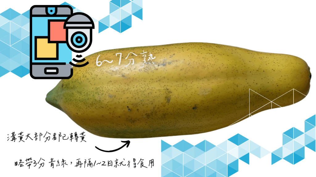 顏色均勻、外型修長飽滿,溝黃呈現6~7熟,還會有點QQ的,放到全黃果肉會偏軟,看個人嗜好。凡是經過薛仲良寄出去的木瓜,都經過他的熟度把關,買回家從五分熟放到七分熟就是最佳賞味期。