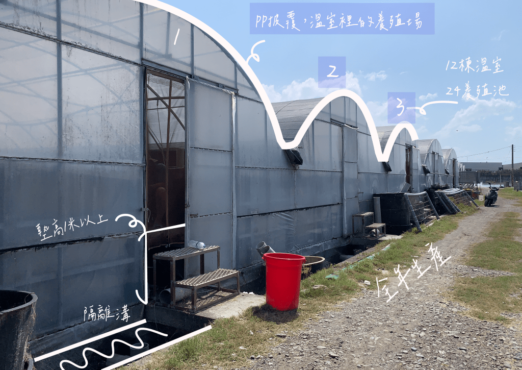 搭建溫室有兩個作用,首先,要維持溫度,一般來說要維持26度~30度。白蝦屬於熱帶蝦,低於18度便會停止攝食。在屏東,儘管遇到寒流都還撐得住,但避免遇到霸王級寒流這樣的寒害,搭建溫室來保溫就很重要。