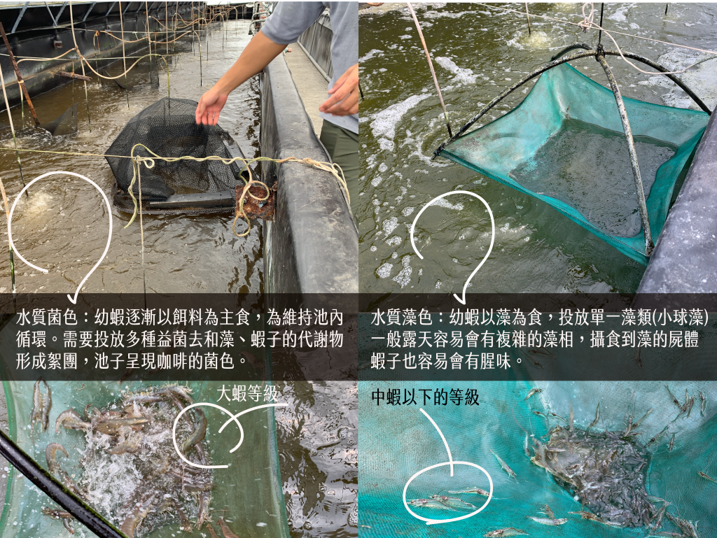 - 絮團養殖技術。藻、菌、代謝物在封閉式環境,調控成可以完整循環的養殖池。蝦子腸線沒有什麼污物、砂子。