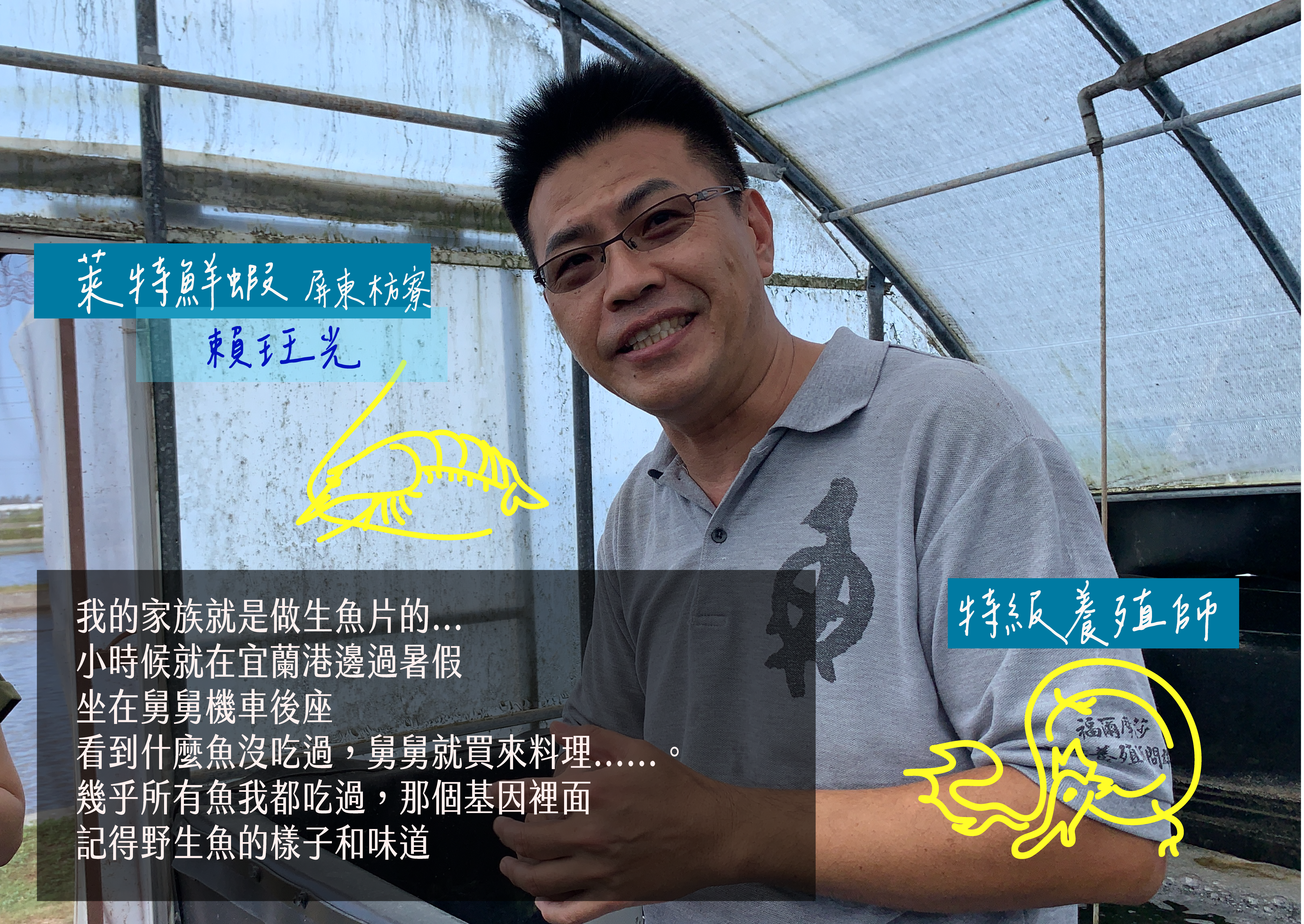 賴玨光(第二個字:ㄐㄩㄝˊ)對於蝦的執念,直接說:「我們要來投入養殖,除了符合市場需求,第二就是你怎麼養出來的是美食。」