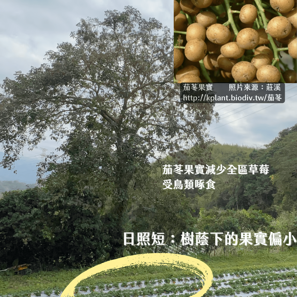 停在茄苳樹上的麻雀偶爾會啄食草莓,但當草莓準備結果時,茄苳樹已經長滿像葡萄般的小漿果。對鳥兒來說,這些小漿果是主食,草莓只是點心,因此損失並不嚴重。