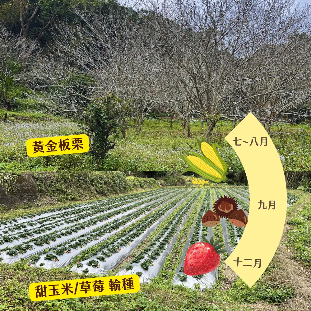 踏上蜿蜒山路,轉進蔡大哥的田園,映入眼簾的是幾株如巨傘般遮蔭的黃金板栗,與零星點綴的香蕉樹。理貨工寮旁,一片片草莓園層層疊疊,分區錯落順著地勢延伸而下,與刺竹、雜木林形成自然交界。這片2.3公頃的有機驗證土地上,栗子、甜玉米、草莓只佔了小小一區,依季節輪替生產,構成了一年的豐收循環。